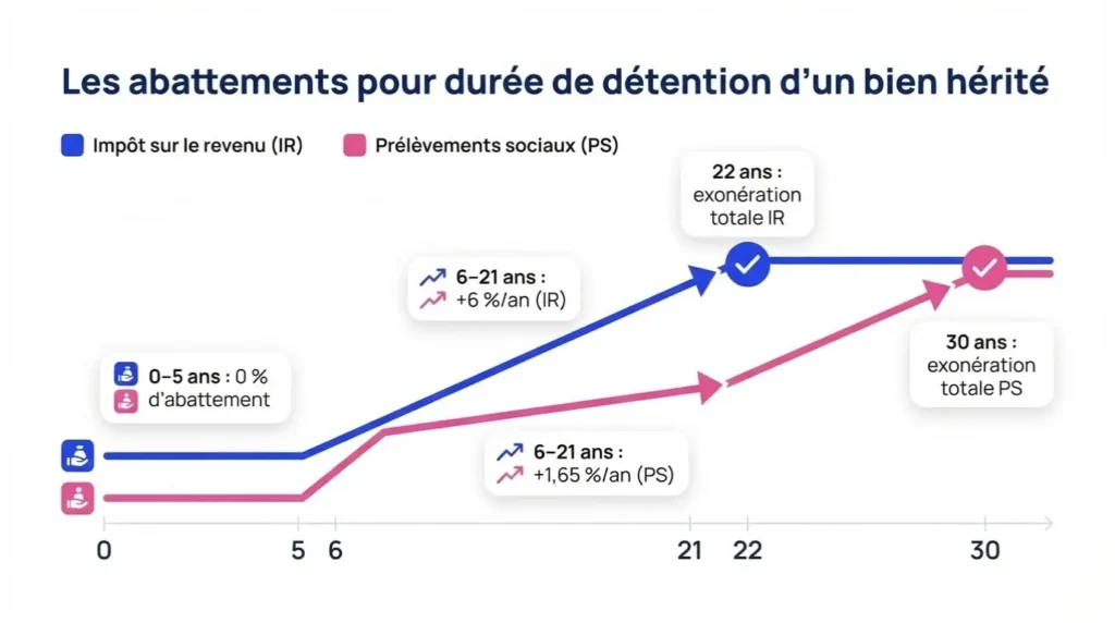 Le principe de base : plus vous conservez le bien longtemps à partir de la date du décès, plus les abattements augmentent. Ils s’appliquent différemment à l’impôt sur le revenu (19 %) et aux prélèvements sociaux (17,2 %).